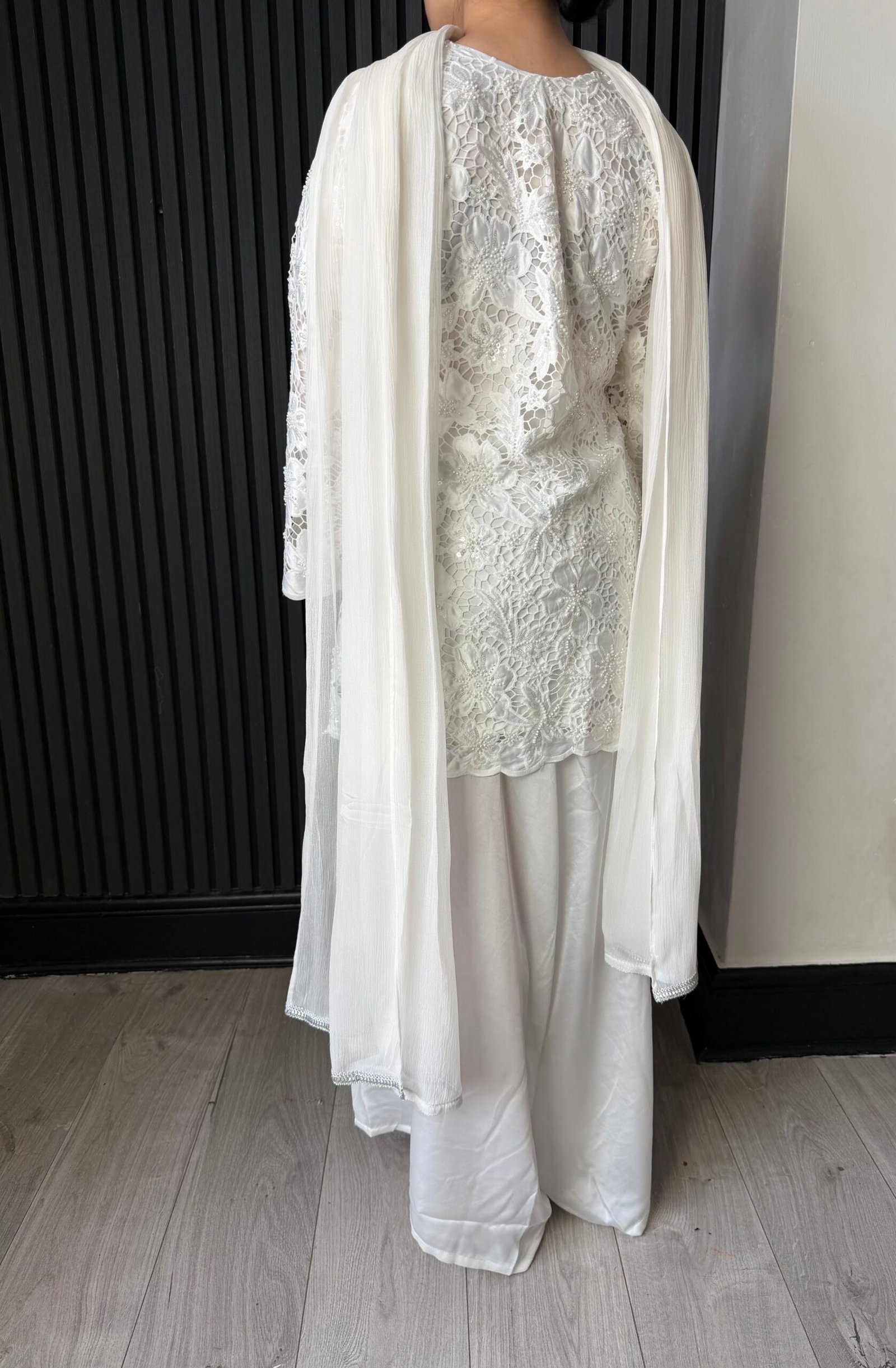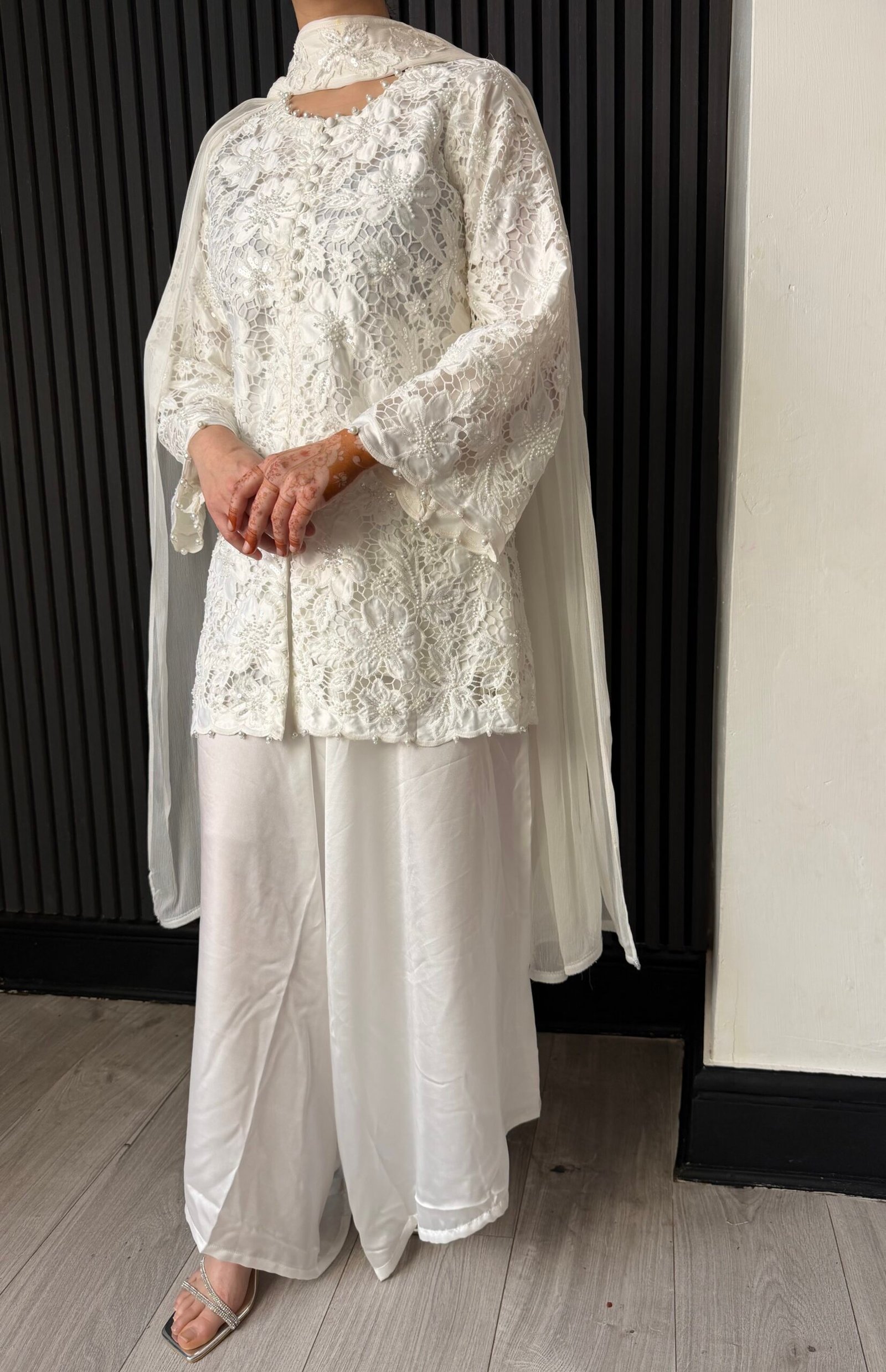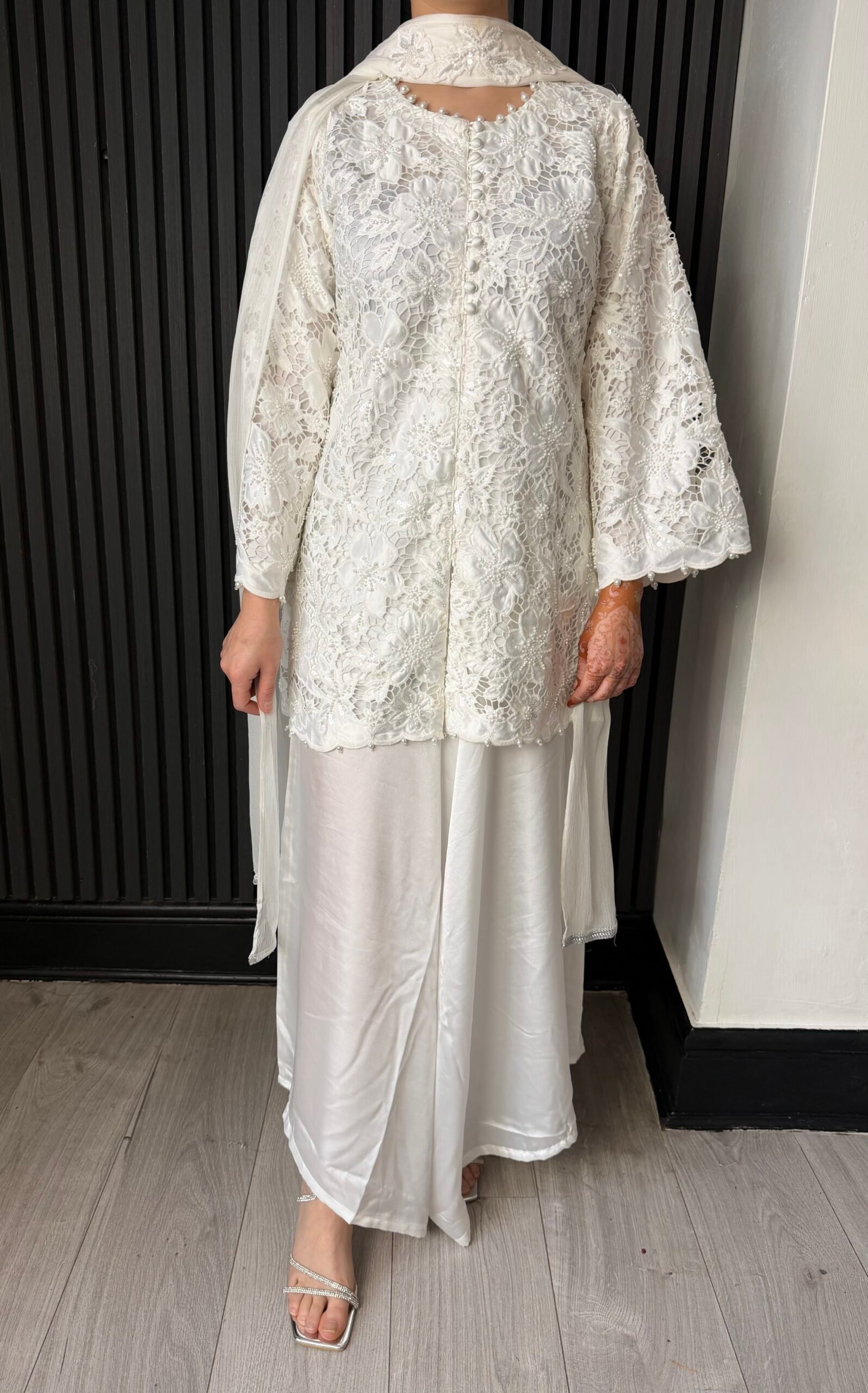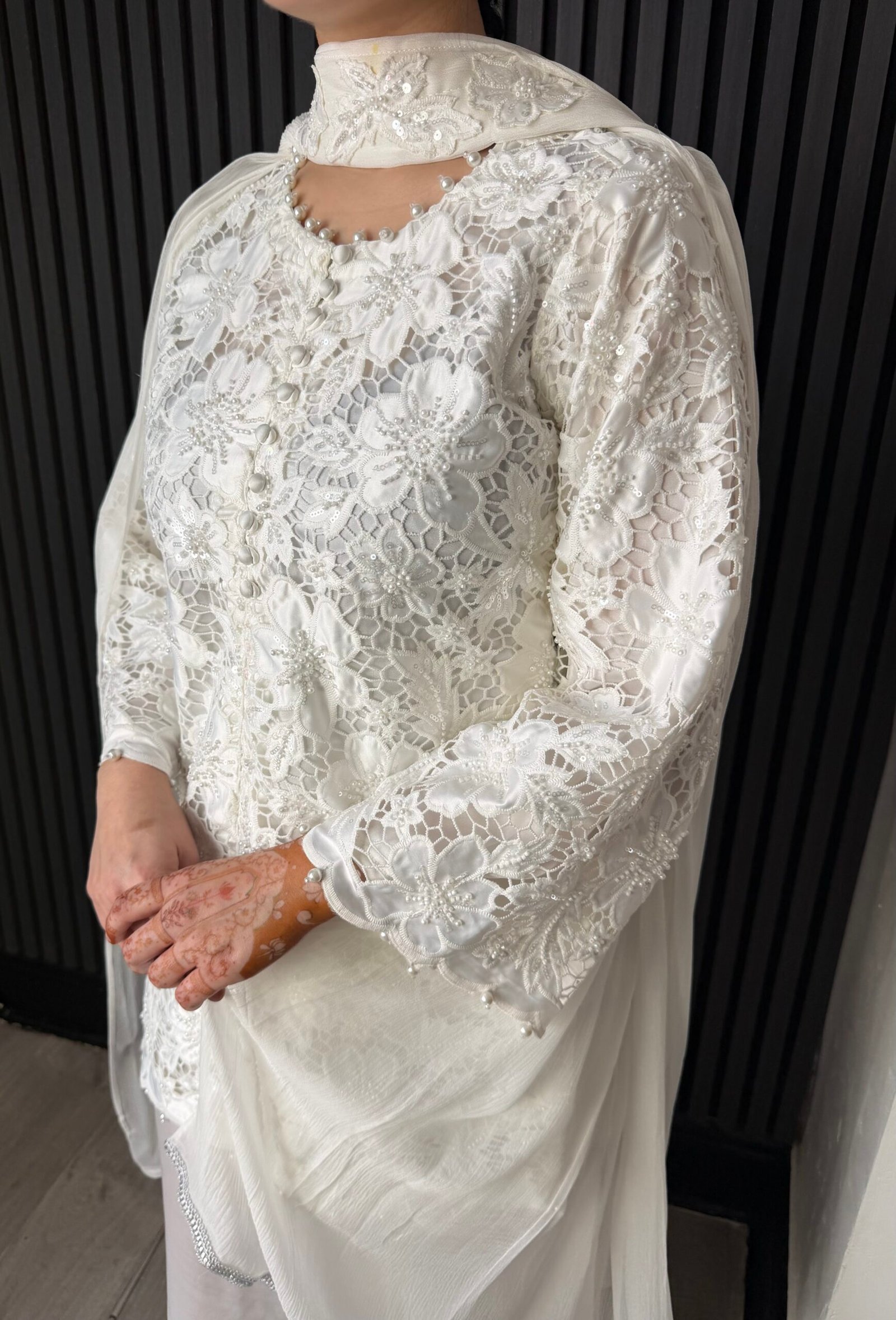 Elevate your elegance with the Noor white Formal Suit, a timeless ensemble crafted for graceful occasions. This exquisite outfit features a delicately crochet shirt adorned with intricate silk floral lacework and subtle embellishments that shimmer with sophistication. The scalloped hem and statement sleeves add a touch of regal charm, while the soft inner lining ensures comfort.
