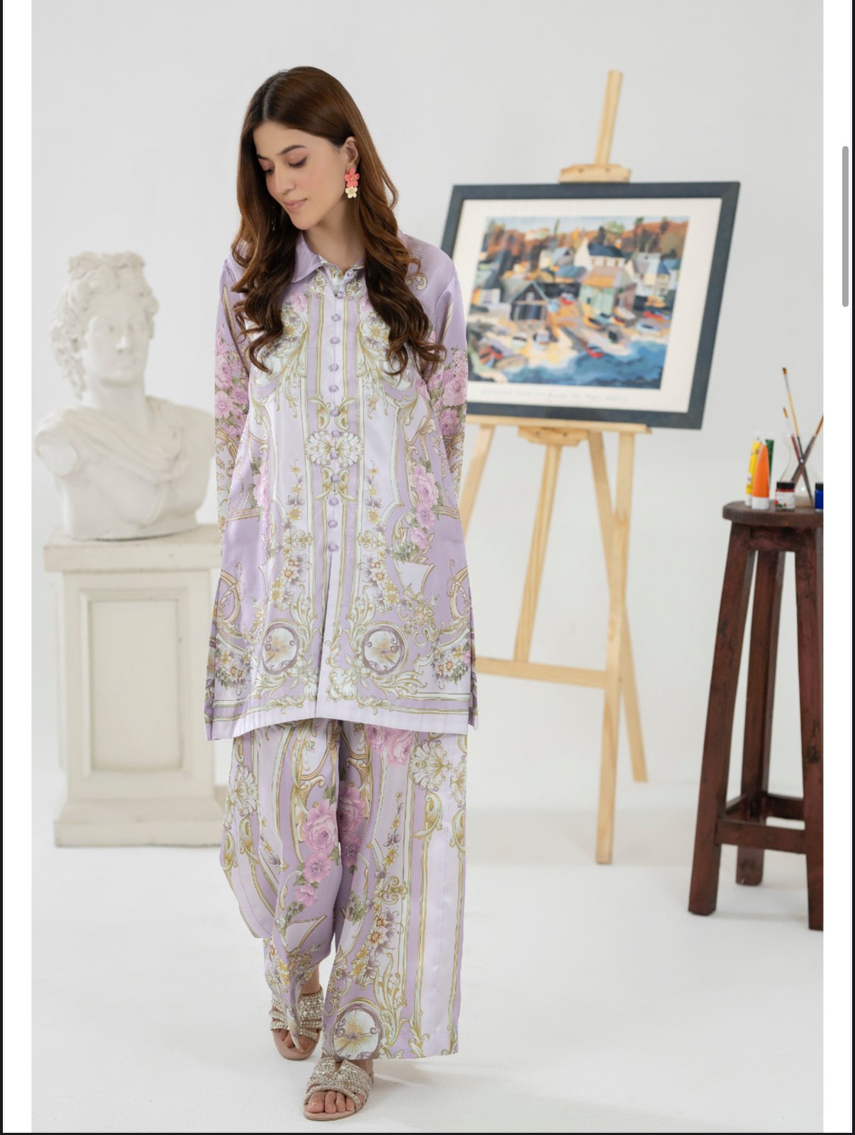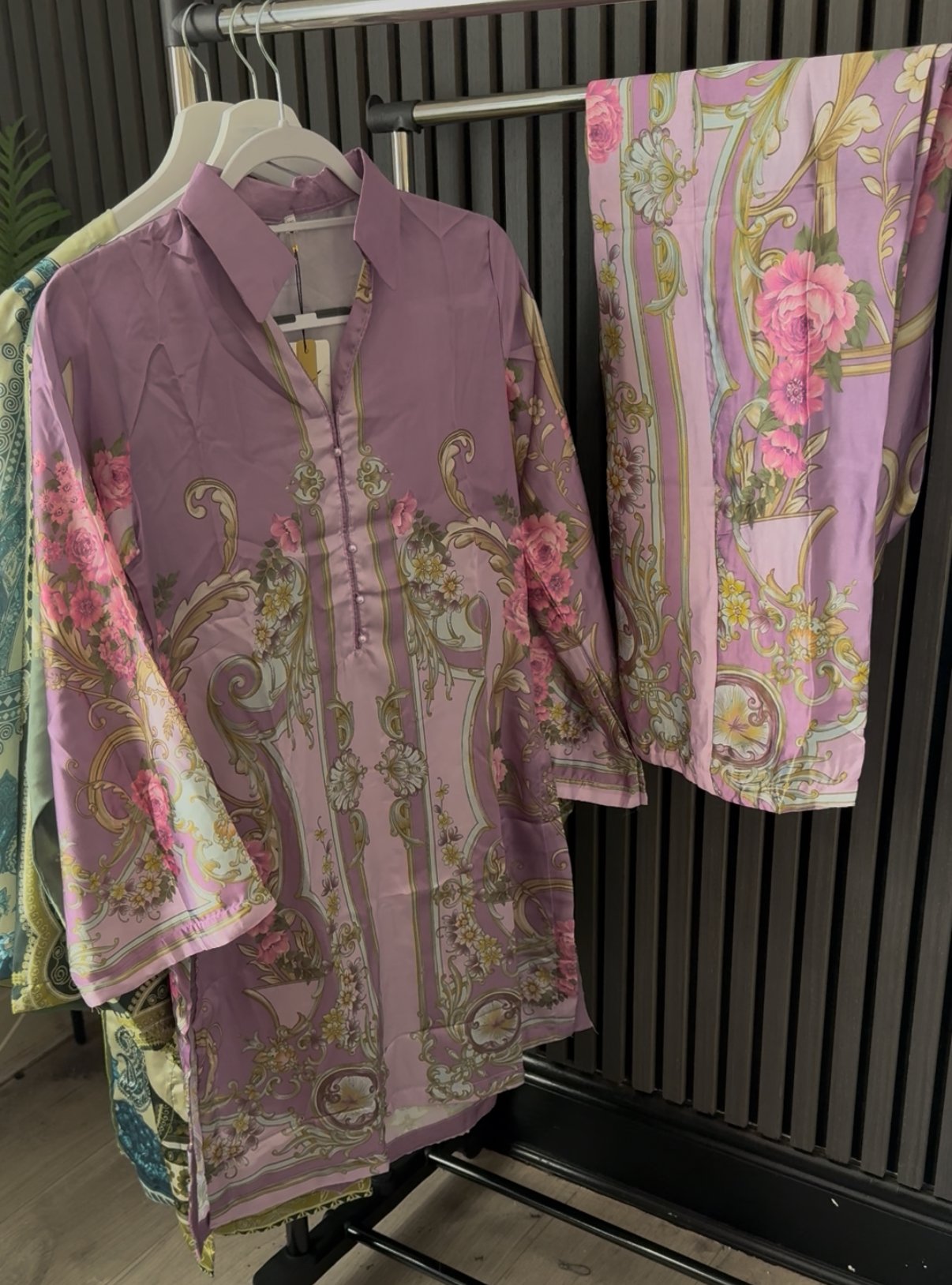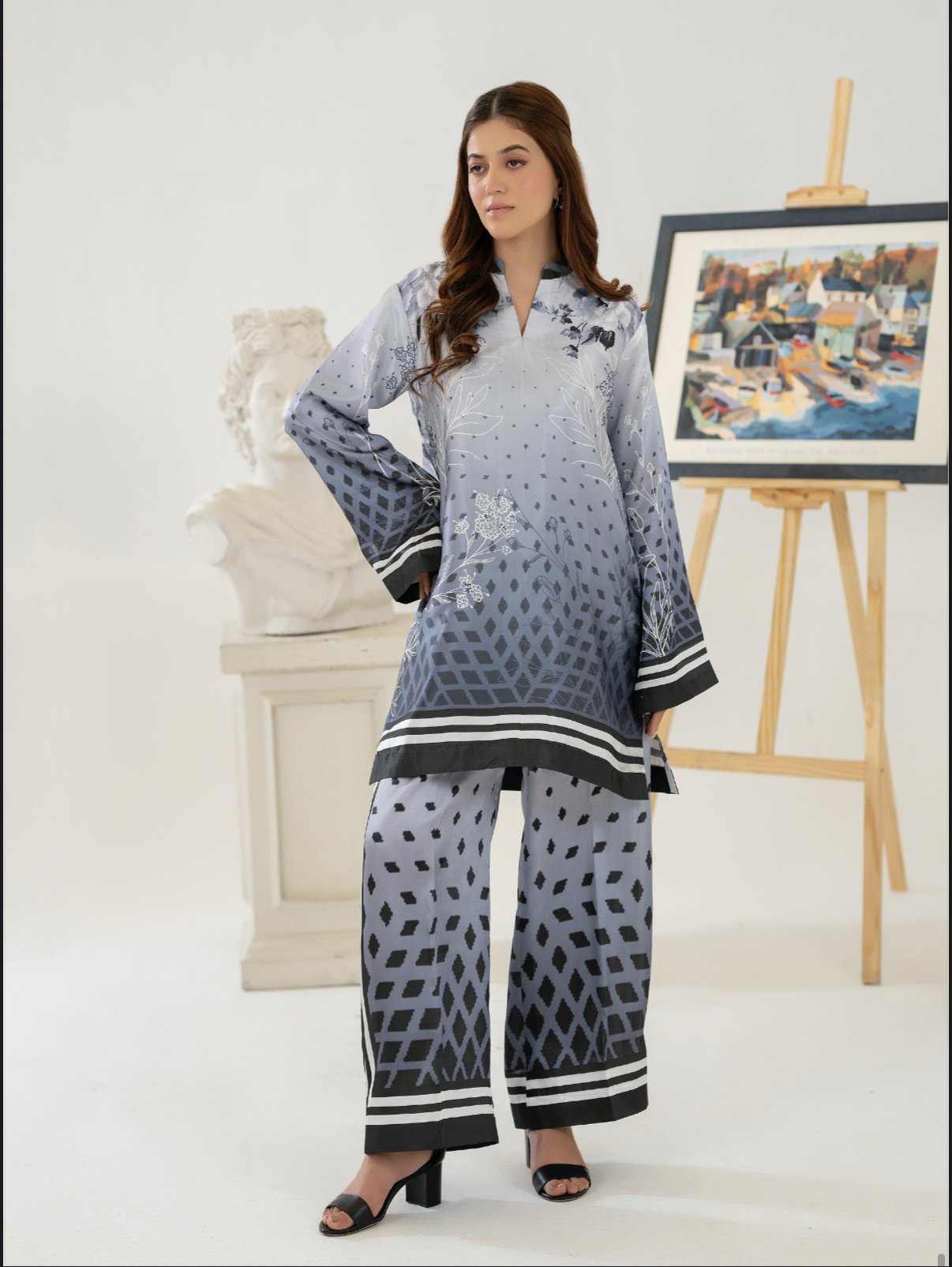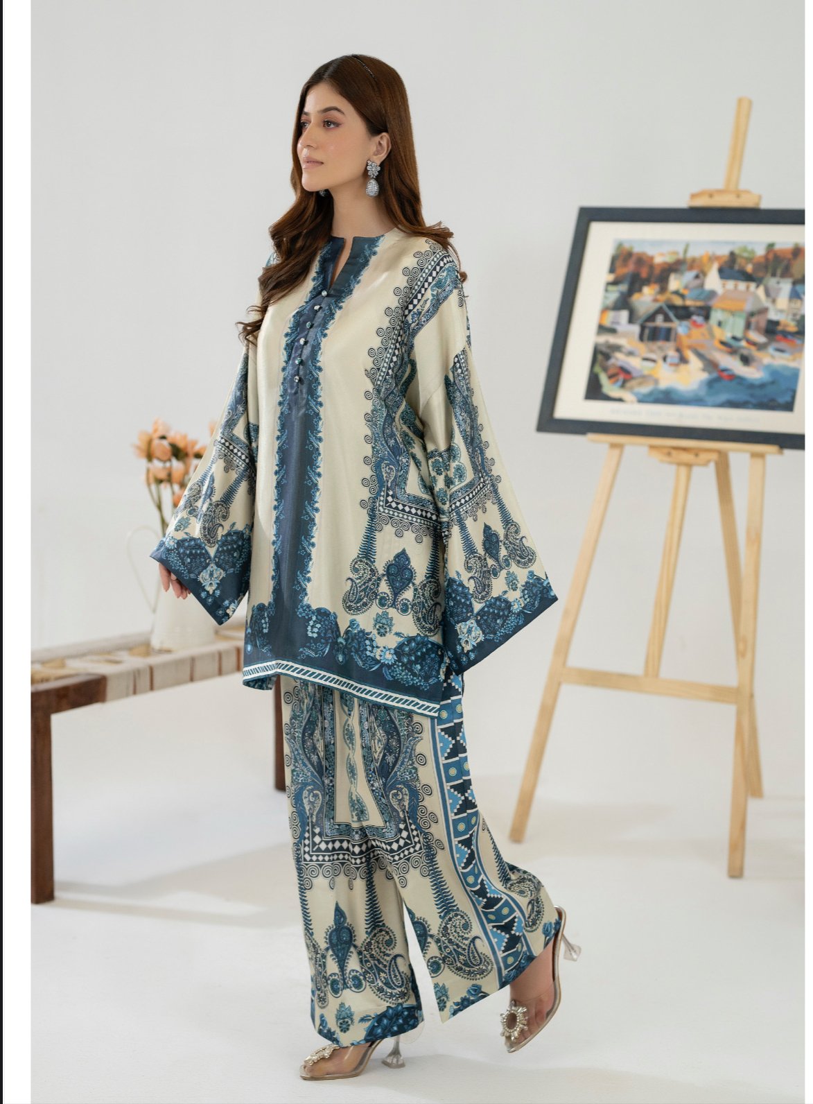 Paired with matching straight-cut trousers, the set creates a cohesive and polished look—perfect for daytime gatherings, casual outings, or semi-formal occasions. The flowy silhouette ensures ease of movement while maintaining a graceful drape.