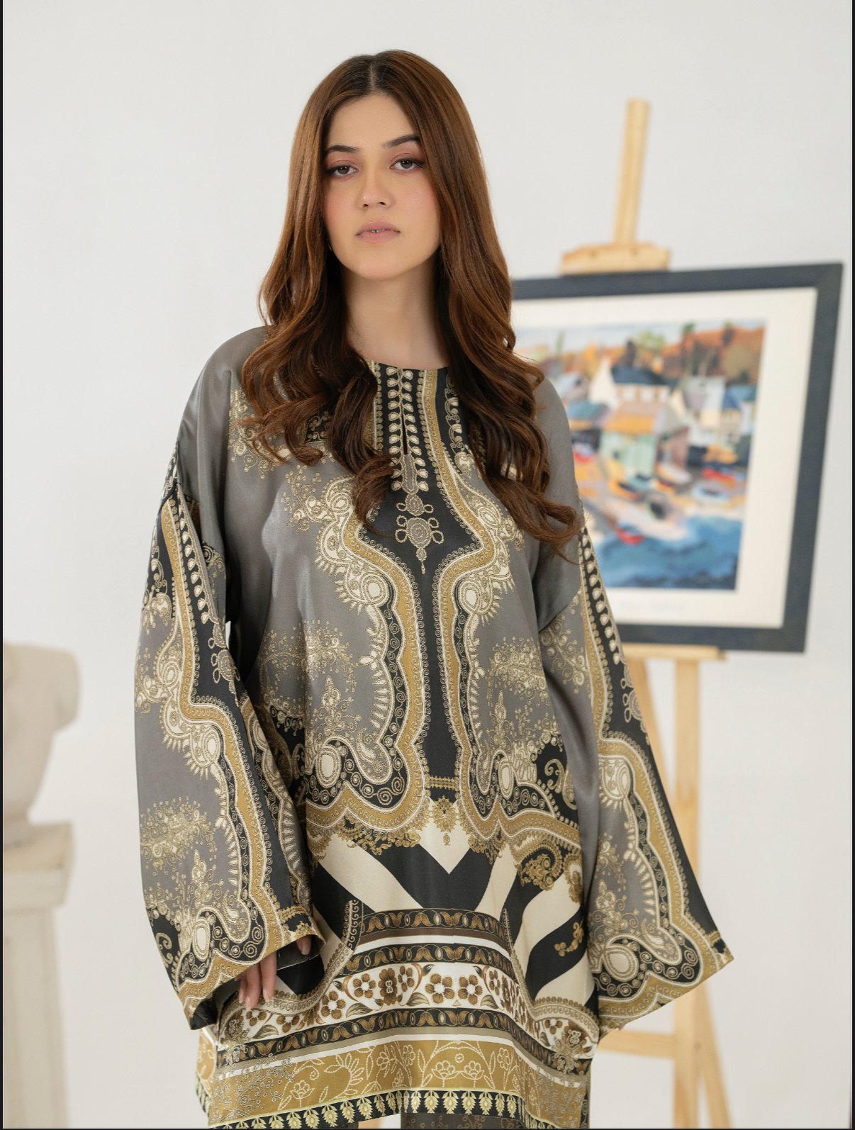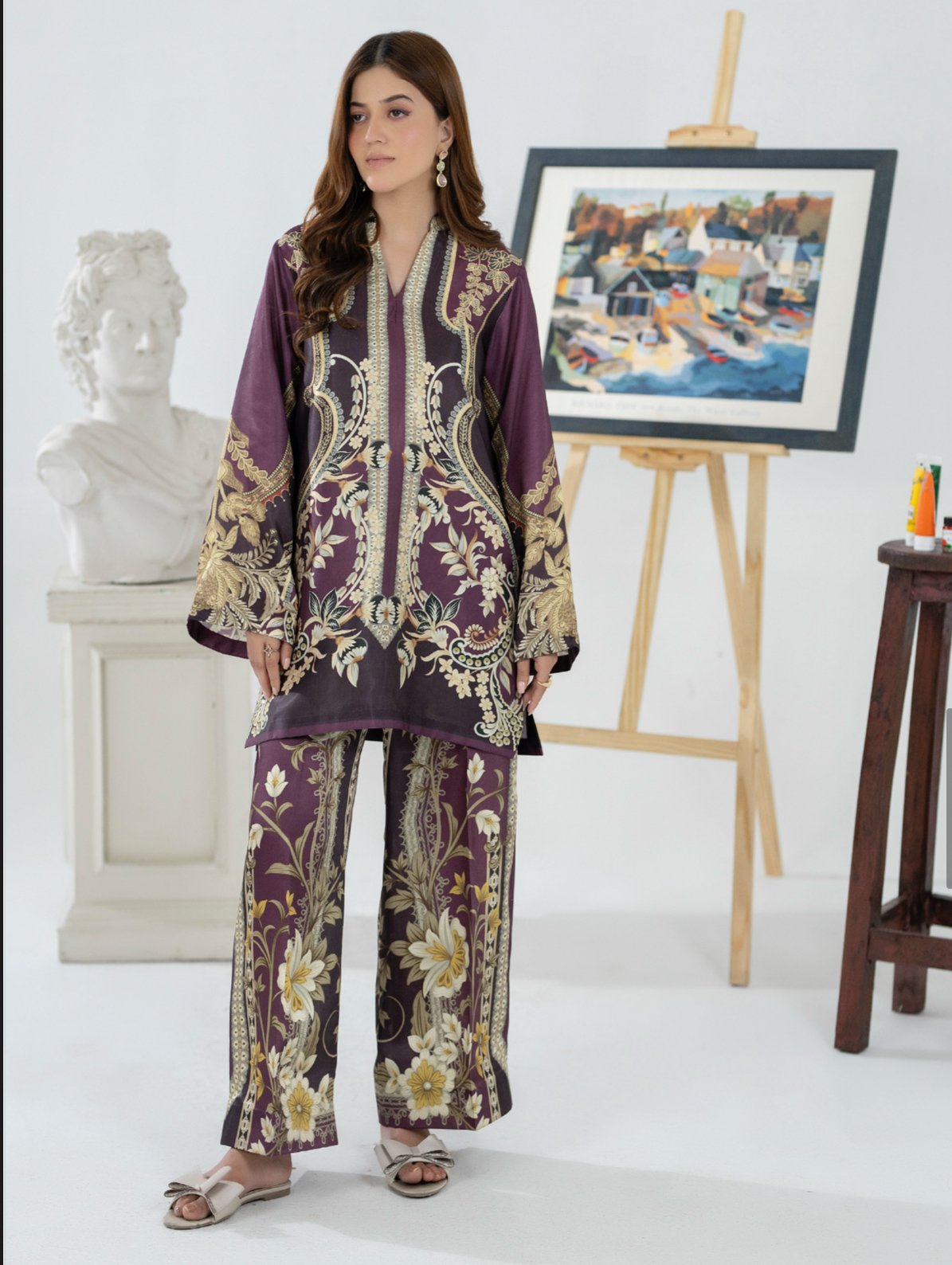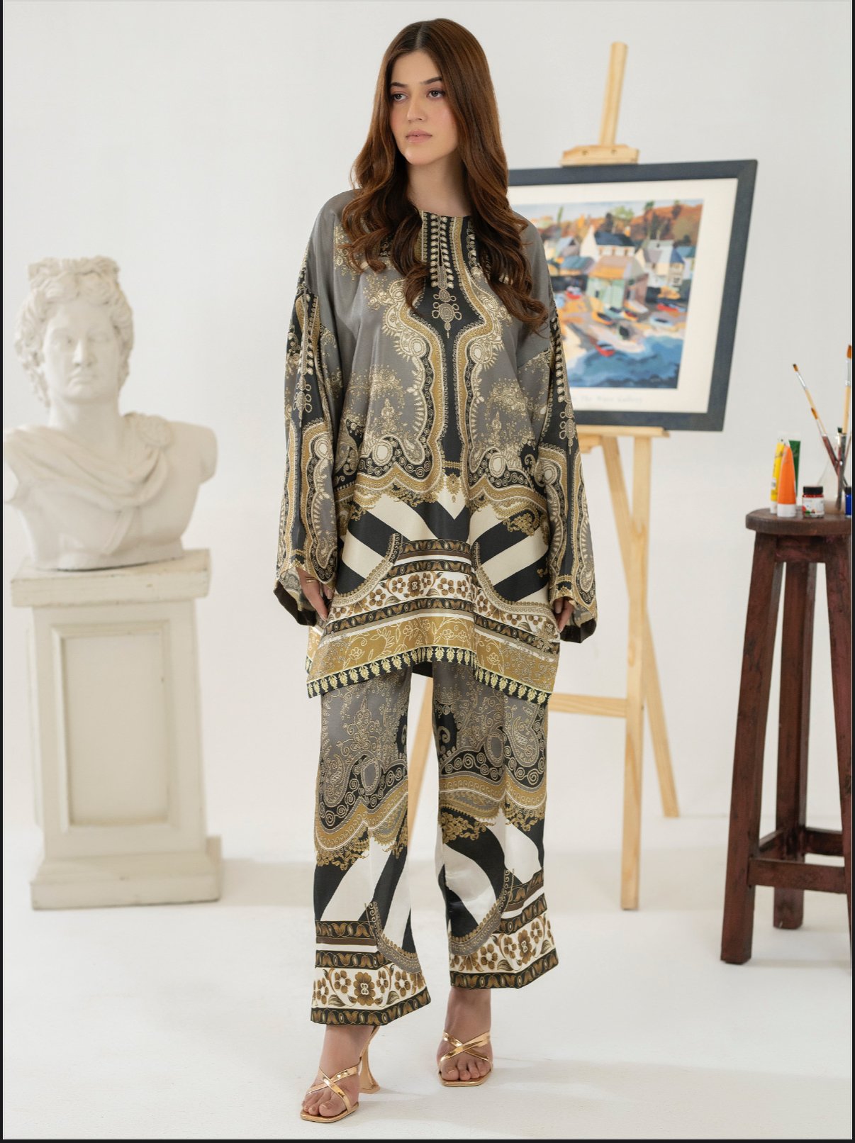 Elevate your wardrobe with this effortlessly elegant two-piece outfit, designed for both comfort and timeless style. Crafted from a lightweight, breathable fabric, this ensemble features a relaxed-fit kurta with wide sleeves and intricate all-over prints in a sophisticated blend. The detailed borders and symmetrical patterns add a refined, artisanal touch.